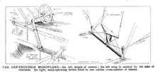 In later examples, such as that in the Shuttleworth Collection, the horizontal tail surface was shorter, the leading edges being swept at about 45°. A distinctive feature of the type was that the trailing edge of the rudder and elevator was braced by wires leading to the control horns. The controls consisted of a wheel mounted on an inverted U-shaped yoke, the uprights of which were outside the fuselage structure. Fore and aft movement of the entire yoke operated the elevator and the wheel operated the wing warping. The rudder was controlled by pedals. The undercarriage consisted of a pair of trapezoidal frames, each braced by a diagonal member extended forwards to form a short upcurved skid to protect the propeller in the case of nose-overs, with a pair of wheels carried on a sprung cross axle between the two frames.[4]