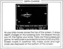 Like the 1977 arcade game Depthcharge that it emulates, Depth Charge puts the player in control of a small ship that drops depth charges onto passing submarines. In the arcade original, the player moves the ship left and right, but in Depthcharge the ship automatically makes three passes from right to left across the top of the screen, and four submarines at varying depths move from left to right below it. Destroying deeper subs earns more points. An extra pass is awarded at 600 points and another at 900.[1][2]