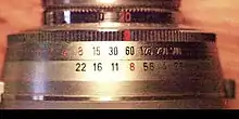 Photographers can use the lens scales to work backwards from the desired depth of field to find the necessary focus distance and aperture.[36] For the 35 mm lens shown, if it were desired for the DOF to extend from 1 m to 2 m, focus would be set so that index mark was centered between the marks for those distances, and the aperture would be set to f/11.[lower-alpha 6]