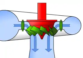 The Deriaz turbine, presented by engineer Paul Deriaz, was the first diagonal hydraulic pump-turbine to be designed.[1][2] In contrast to most hydraulic machines, the flow in a Deriaz turbine does not follow a full axial nor radial direction but is a diagonal mixture of the two. Deriaz turbines, like Kaplan turbines, can also have adjustable runner blades to reach highest efficiencies at variable discharge (double regulation). Deriaz turbines are installed at the Sir Adam Beck Pump Generating Station at Niagara Falls.[3]