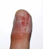 Skin chewing can be bolstered by times of apprehension and other unpleasant events.[9] Blisters in particular can cause a feeling of desire to pull or bite off the affected skin and nails (since the skin is dead, thus easily pulled off), which could be detrimental, causing infection. Another disorder, known as excoriation disorder, the repetitive action of uncontrollably picking at one's skin, can sometimes accompany dermatophagia. Dermatophagia differs from excoriation disorder in that the repetitive motion affected persons partake in is the biting of the skin.[10] People who have dermatophagia can also be prone to infection as when they bite their fingers so frequently, they make themselves vulnerable to bacteria seeping in and causing infection. Dermatophagia can be considered a "sister" disorder to trichophagia, which involves compulsively biting and eating one's hair.[11]