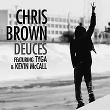 "Deuces" is a song written and performed by American singer Chris Brown featuring fellow American musicians Tyga and Kevin McCall. Produced by McCall, "Deuces" was released digitally on June 25, 2010, as the lead single from Brown's first collaborative effort with Tyga, titled Fan of a Fan (2010). The song is a slow, down-tempo R&B ballad featuring elements from the genres of house and pop music, while the song is lyrically about "breaking it off with a girl after failed attempts to make the relationship work".[1] "Deuces" was later included on Brown's fourth studio album, F.A.M.E. (2011).