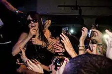Dev's electro style and "sing-talk" vocal style have been compared to fellow pop singer Kesha.[27] Dev responded to this, saying, "I'm confident enough in what I do that people will see me for who I am ... I get why people compare us but once people see me live they won't connect us as much."[8] While comparing her to Kesha, Idolator wrote that "Dev's beats come off a bit more mellow and her songs a little bit more electro than pop."[27] In response to being compared to both Kesha and Uffie, Dev said, "I just feel that I have a lot more to say and the ability to have an eclectic sound, I'm not bashing either artist, but I'm going to be able to give you a little bit more than what you've heard on those records. When my album comes out, hopefully I won't have to hear another reference or comparison."[4] Much of Dev's music is inspired by rap music, as she believes that fans respond to "pop music but with rap roots". She said, "I've always been into hip-hop. Eminem changed my life when I was younger."[8] The Hollywood Reporter compared her "futuristic" and "pulsing" sound to underground electroclash musicians Peaches and Yelle.[8] Dev's musical genres have been cited as electro-crunk[28] and electropop.[8][27]