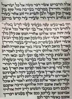 Devarim, Dvarim, or Debarim (Hebrew: דְּבָרִים, romanized: Dəwārim, lit. 'things' or 'words') is the 44th weekly Torah portion (פָּרָשָׁה, parašāh) in the annual Jewish cycle of Torah reading and the first in the Book of Deuteronomy. It comprises Deuteronomy 1:1–3:22. The parashah recounts how Moses appointed chiefs, the episode of the Twelve Spies, encounters with the Edomites and Ammonites, the conquest of Sihon and Og, and the assignment of land for the tribes of Reuben, Gad, and Manasseh.