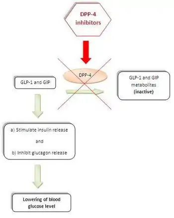 Dipeptidyl peptidase-4 inhibitors (DPP-4 inhibitors) are enzyme inhibitors that inhibit the enzyme dipeptidyl peptidase-4 (DPP-4). They are used in the treatment of type 2 diabetes mellitus. Inhibition of the DPP-4 enzyme prolongs and enhances the activity of incretins that play an important role in insulin secretion and blood glucose control regulation.[1] Type 2 diabetes mellitus is a chronic metabolic disease that results from inability of the β-cells in the pancreas to secrete sufficient amounts of insulin to meet the body's needs. Insulin resistance and increased hepatic glucose production can also play a role by increasing the body's demand for insulin. Current treatments, other than insulin supplementation, are sometimes not sufficient to achieve control and may cause undesirable side effects, such as weight gain and hypoglycemia. In recent years, new drugs have been developed, based on continuing research into the mechanism of insulin production and regulation of the metabolism of sugar in the body. The enzyme DPP-4 has been found to play a significant role.[2]