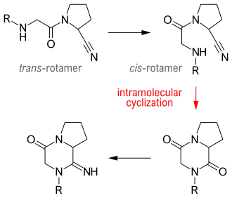 In general, DPP-4 inhibitors are not very stable compounds. Therefore, many researchers focus on enhancing the stability for cyanopyrrolidines. The most widespread technique to improve chemical stability is to incorporate a steric bulk. The two cyanopyrrolidines that have been most pronounced, vildagliptin and saxagliptin, were created in this manner. K579 is a DPP-4 inhibitor discovered by researchers at Kyowa Hakko Kyogo. It had improved not only chemical stability but also a longer-lasting action. That long-lasting action was most likely due to slow dissociation of the enzyme-inhibitor complex and an active oxide metabolite that undergoes enterohepatic circulation. The discovery of the active oxide was in fact a big breakthrough as it led to the development of vildagliptin and saxagliptin. One major problem in DPP-4 inhibitor stability is intramolecular cyclization. The precondition for the intramolecular cyclization is the conversion of the trans-rotamer, which is the DPP-4 binding rotamer (Figure 5). Thus, preventing this conversion will increase stability. This prevention was successful when incorporating an amide group into a ring, creating a compound that kept the DPP-4 inhibitory activity that, did not undergo the intramolecular cyclization and was even more selective over different DPP enzymes. It has also been reported that a cyanoazetidine in the P1 position and a β-amino acid in the P2 position increased stability.[6]