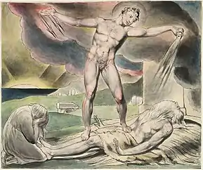 Zechariah's vision of recently deceased Joshua the High Priest depicts a dispute in the heavenly throne room between Satan and the Angel of the Lord (Zechariah 3:1–2).[24] The scene describes Joshua the High Priest dressed in filthy rags, representing the nation of Judah and its sins,[25] on trial with God as the judge and Satan standing as the prosecutor.[25] Yahweh rebukes Satan[25] and orders that Joshua be given clean clothes, representing God's forgiveness of Judah's sins.[25] Goulder (1998) views the vision as related to opposition from Sanballat the Horonite.[26] Again, Satan acts in accordance with God's will. The text implies he functions both as God's accuser and as his executioner.[27]