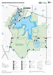 In 2012, after 6 years of land renovation that required a budget $1.6 million, the reserve reopened to the public.[8] The reserve was inaugurated by Peter Walsh, and took the name Devilbend Natural Features Reserve on this day. Among the new features of the park are the entrance gateway, the asphalt entrance road, sealed car park, the picnic and barbecue facilities, the walking tracks and the boardwalk.[7]
