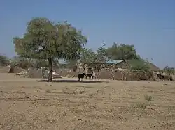 Dhani[1] (Hindi: ढाणी ḍhāṇī) or Thok[2] is a type of hamlet, the smallest conglomeration of houses, in the sandy Bagar region of the northwestern states of Rajasthan, Haryana and Punjab in India. Per the Census of India, 70% of Indians live in villages. 80% of the villages have a population of less than 1000 people and each consists of a cluster of hamlets (e.g. dhani, nesada, pada, bigha). Most dhanis are nucleated settlements, while others are more dispersed. A dhani could be as small as one isolated house for a single family or a small cluster of several houses which could grow in number with successive generations, and even become a village by itself. All families living in a dhani are relatives or at least are of the same caste. An isolated collection of several dhanis, which could be few hundred meters apart,[3] constitutes a gram panchayat village community.[4] A typical dhani in the arid zone of Rajasthan is a cluster of huts with a boundary (bara or बाड़ा) made of dried shrubs around it and with owners' livestock such as goats, sheep and camels inside the bara.[5][2][6][7][8][9][10] Dhani are atypically mud huts in Rajasthan. Houses in dani nowadays are made of modern brick and mortar, specially in affluent higher-per-capita-income states of Haryana and Punjab, and some richer families of Rajasthan.