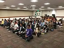 The temple's services are attended by a diverse demographic, with its largest demographic being young adult Caucasians.[19] The temple does not actively advertise itself and relies mostly on word of mouth to attract members. Its events are mainly coordinated online through platforms such as Facebook.[19] Dharma Bum Temple focuses on the development of its community around the structure of families, offering individual programs for each age group; including for young children, teenagers, and adults, and has a family program called the "Family Sangha".[20] Along with traditional Buddhist services, Dharma Bum Temple also hosts a Buddhism based support group called the "Recovery Sangha". The program combines elements of the traditional Twelve-Step Program with Buddhism and meditation to help drug and alcohol addicts overcome their addictions.[28][25] The temple hosts multiple Buddhism and meditation classes throughout the week. As of December 2018, its most popular weekly services were attracting around 70 people per class.[18]