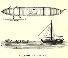 The Doney, or Tony, of the Eastern coast, is a large awkward vessel, and carries very heavy cargoes, even to the ports on the western shore of the Peninsula. They have one mast, and a square sail, sometimes using a small topsail. They are reckoned sea-worthy; but have no accommodation for Europeans, and are generally very heavy sailers.[7]