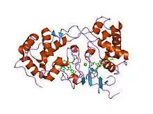 In molecular biology, the di-haem cytochrome c peroxidase family is a group of distinct cytochrome c peroxidases (CCPs) that contain two haem groups. Similar to other cytochrome c peroxidases, they reduce hydrogen peroxide to water using c-type haem as an oxidizable substrate. However, since they possess two, instead of one, haem prosthetic groups, this family of bacterial CCPs reduce hydrogen peroxide without the need to generate semi-stable free radicals. The two haem groups have significantly different redox potentials. The high potential (+320 mV) haem feeds electrons from electron shuttle proteins to the low potential (-330 mV) haem, where peroxide is reduced (indeed, the low potential site is known as the peroxidatic site).[1] The CCP protein itself is structured into two domains, each containing one c-type haem group, with a calcium-binding site at the domain interface. This family also includes MauG proteins, whose similarity to di-haem CCP was previously recognised.[2]