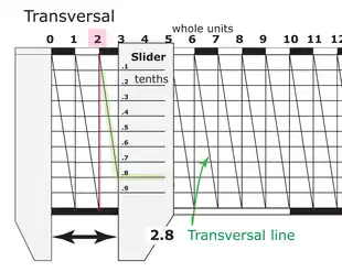 Transversals are a geometric construction on a scientific instrument to allow a graduation to be read to a finer degree of accuracy. Their use creates what is sometimes called a diagonal scale, an engineering measuring instrument which is composed of a set of parallel straight lines which are obliquely crossed by another set of straight lines. Diagonal scales are used to measure small fractions of the unit of measurement.[1]