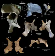 As of 2023, three additional specimens have been described since its initial description: each specimen has been nicknamed as "Alex" for AODF 836, "Oliver" for AODF 663 and "Ann" for AODF 0906.[6] The second specimen, AODF 836, was described in 2016. It includes portions of the skull, including a left squamosal, nearly complete braincase, right surangular, and various fragments. Additionally, the specimen also includes the atlas, axis, five other cervical vertebrae, three dorsal vertebrae, additional dorsal ribs, portions of the hip, and another right scapula.[7] In 2021, the referred material was thoroughly described.[8] In 2022, the third specimen, AODF 663, was referred to as a juvenile specimen.[9] In 2023, the fourth specimen, AODF 0906, consisting of a partial postcranial skeleton and a more complete skull with previously unknown numerous cranial elements intact has been described in detail.[6]