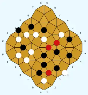 Capturing moves are possible in the Movement phase. If the points of a triangle contain exactly one white and one black piece, either player can capture the opponent piece by occupying the remaining open point ("cornering" the enemy piece on the triangle). The captured piece can be cornered on one triangle (see Example 1), or simultaneously cornered on two different triangles (Example 4). The captured piece is immediately removed from the game and replaced on its point by a neutral piece.[2]