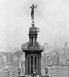 Diana was unveiled atop Madison Square Garden's tower on September 29, 1891. The 304-foot (92.66 m) building had been completed a year earlier, and was the second-tallest in New York City. But the addition of the statue made it the city's tallest, by 13 feet (3.96 m).[5] The figure's billowing copper foulard (scarf) was intended to catch the wind, but the statue did not rotate smoothly because of its weight. Diana's nudity offended moral crusader Anthony Comstock and his New York Society for the Suppression of Vice.[6] To placate Comstock and to increase the likelihood of its catching the wind, Saint-Gaudens draped the figure in cloth, but the cloth blew away.[7]