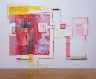 In the 2000s, Cooper expanded her practice to include furniture-like sculptures and full installations that increasingly colonized their exhibition spaces.[40][41][42][43] Speedway (2000–3) was a freestanding, De Stijl-styled foamcore structure, consisting on one side of a cutaway that Nancy Princenthal described as "a Las Vegas marquee of pulsing concentric and parallel lines, punctuated by seedily alluring little niches,"[44] and on the other, a dollhouse-like grid of cubbyholes, suggesting a Mondrian/Donald Judd-influenced "mini-museum."[7][34] The mutating, increasingly elaborate installation Orange Alert UK (2003-8) employed taut linear arrangements of vivid reds, oranges and yellows, initially inspired by the color-coded, post-9/11 terrorist alert system, which formed cardiograph-like wall patterns and radiated from a central, spider-like form.[24][30][1][45]