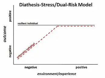 Some theories have branched from the diathesis-stress model, such as the differential susceptibility hypothesis, which extends the model to include a vulnerability to positive environments as well as negative environments or stress.[13] A person could have a biological vulnerability that, when combined with a stressor, could lead to psychopathology (diathesis–stress model); but that same person with a biological vulnerability, if exposed to a particularly positive environment, could have better outcomes than a person without the vulnerability.[13]