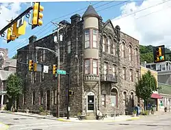 Dick Building, also known as the Cornerstone Building, is a historic commercial and apartment building located at West Newton, Westmoreland County, Pennsylvania. The original section was built in 1890, with an addition made between 1910 and 1925. It is a three-story, "L"-shaped brick building executed in the Romanesque Revival style. It features a corner semi-circular turret with a conical roof. The building once housed a bank on its first floor.[2]