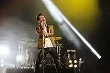 For its 2010 edition, headlining performances in Times Square included Daughtry, and Jennifer Lopez (who infamously wore a dark-colored catsuit for her performance to mixed reviews),[52] while Melissa Rycroft served as a correspondent. Fergie hosted concert segments on-location from Las Vegas, Nevada, featuring performances by her group The Black Eyed Peas, Colbie Caillat, Robin Thicke, Keri Hilson, Selena Gomez, Justin Bieber, David Guetta, and Orianthi.[53] American Idol season 8 runner-up Adam Lambert stated that he was also reportedly scheduled to perform, but dropped from both Rockin' Eve and a scheduled appearance on fellow ABC program Jimmy Kimmel Live! in response to his controversial performance at the American Music Awards (which are also produced by Dick Clark Productions). Neither ABC nor Dick Clark Productions ever confirmed whether or not Lambert had been booked at all, however.[54]