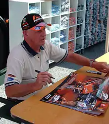 Dick Johnson retired from racing at the end of the 1999 season, though he remains in charge of DJR. He did however make a one-off final appearance in front of his home crowd at the Queensland 500 in 2000 with his son Steven who had taken over driving Dick's famous Number 17 and continued to for over a decade after.[6] Johnson has twice written his autobiography as well as contributing to a third biography.[2][7][8]