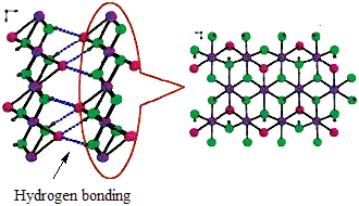 Botallackite crystallizes in monoclinic with space group P21/m. Like in atacamite, there are two different types of Cu coordination geometries: Jahn-Teller distorted octahedral [Cu(OH)4Cl2] and [Cu(OH)5Cl]. But these octahedra assemble in different ways. Each octahedron shares six edges with surrounding octahedra, forming a two-dimensional sheet-type structure parallel to (100). The adjacent sheets are held together by hydrogen bonding between the hydroxyl oxygen atoms of one sheet and the opposing chlorine atoms in the other sheets. The resulting weak bonding between the sheets accounts for the perfect (100) cleavage and the typical platy habit of botallackite (Figure 2).[4][5][7]