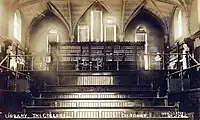 The Old Chapel building, originally the college chapel, is one of the campus's listed buildings, gaining Grade II listed status on 6 June 1994. It is a two-storey building constructed in gothic style, with Flemish bond brickwork, built on a sandstone plinth in 1842.[94] It is also likely to be the work of Richard Lane.[33] The structure consists of three wings, containing a central hall range, with two domestic wings on each side,[94] initially used as tutor accommodation,[33] forming a symmetrical appearance with the gable end of the upper hall.[94] For many years it was used as a library and lecture theatre. The ground floor eventually became the student union, and contained a bar and café.[95][96] The first floor was used as the base of ESRI (Education and Social Research Institute) and lecture space.[97]