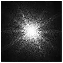Fourier transform modulus (diffraction pattern) of the grayscale image shown being reconstructed at the top of the page.