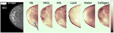 ![]() Example of breast constituents' concentrations maps through optical mammography (right cranio-caudal view). The blue arrow points to the lesion. Hb stands for deoxy-hemoglobin, HbO2 for oxy-hemoglobin, tHb for total hemoglobin.[1] | |