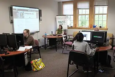 A digital studio provides both a technology-equipped space and technological/rhetorical support to students (commonly at a university) working individually or in groups on a variety of digital projects, such as designing a website, developing an electronic portfolio for a class, creating a blog, making edits, selecting images for a visual essay, or writing a script for a podcast.[1]