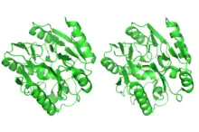 - ↑ PDB: 3I2E; Wang W, Monzingo AF, Hu S, Schaller TH, Robertus JD, Fast W (2009). "Developing Dual and Specific Inhibitors of Dimethylarginine Dimethylaminohydrolase-1 and Nitric Oxide Synthase: Toward a Targeted Polypharmacology To Control Nitric Oxide". Biochemistry. 48 (36): 8624–8635. doi:10.1021/bi9007098. PMC 2746464. PMID 19663506.; rendered via PyMOL.