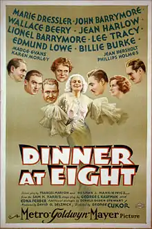 Dinner at Eight is a 1933 American pre-Code comedy-drama film directed by George Cukor from a screenplay by Frances Marion and Herman J. Mankiewicz, based on George S. Kaufman and Edna Ferber's 1932 play of the same title. The film features an ensemble cast of Marie Dressler, John Barrymore, Wallace Beery, Jean Harlow, Lionel Barrymore, Lee Tracy, Edmund Lowe, and Billie Burke.