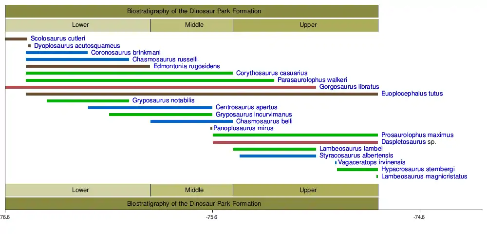 The Dinosaur Park Formation can be divided into at least two distinct faunas. The lower part of the formation is characterized by the abundance of Corythosaurus and Centrosaurus. This group of species is replaced higher in the formation by a different ornithischian fauna characterized by the presence of Lambeosaurus and Styracosaurus. The appearance of several new, rare species of ornithischian at the very top of the formation may indicate that a third distinct fauna had replaced the second during the transition into younger, non-Dinosaur Park sediments, at the same time an inland sea transgresses onto land, but there are fewer remains here. An unnamed pachyrhinosaur, Chasmosaurus irvinensis, and Lambeosaurus magnicristatus may be more common in this third fauna.[3][4]