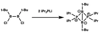 In 2002, a direct synthesis to a diphosphadiboretanediyl, a diphosphadiboretane derivative, was accomplished using 1,2-dichlorodiborane and a lithium phosphide reagent.[2]