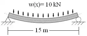Simply supported beam with a constant 10 kN per meter load over a 15m length.