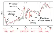 The directional-change intrinsic time operator was developed for the analysis of financial market data series. It is an alternative methodology to the concept of continuous time.[1] Directional-change intrinsic time operator dissects a data series into a set of drawups and drawdowns or up and down trends that alternate with each other. An established trend comes to an end as soon as a trend reversal is observed. A price move that extends a trend is called overshoot and leads to new price extremes.