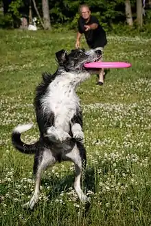 Disc dog (commonly called Frisbee dog) is a dog sport. In disc dog competitions, dogs and their human flying disc throwers compete in events such as distance catching and somewhat choreographed freestyle catching. The sport celebrates the bond between handler and dog, by allowing them to work together. The term "disc" is preferred because "Frisbee" is a trademark (held by Wham-O) for a brand of flying disc.