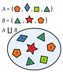 | Statement | The disjoint union of the sets A and B is the set formed from the elements of A and B labelled (indexed) with the name of the set from which they come. So, an element belonging to both A and B appears twice in the disjoint union, with two different labels. |