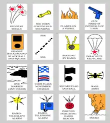 A distress signal, also known as a distress call, is an internationally recognized means for obtaining help. Distress signals are communicated by transmitting radio signals, displaying a visually observable item or illumination, or making a sound audible from a distance.