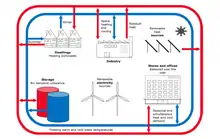 Compared to the previous generations the temperature levels have been reduced to increase the energy efficiency of the system, with supply side temperatures of 70 °C and lower. Potential heat sources are waste heat from industry, CHP plants burning waste, biomass power plants, geothermal and solar thermal energy (central solar heating), large scale heat pumps, waste heat from cooling purposes and data centers and other sustainable energy sources. With those energy sources and large scale thermal energy storage, including seasonal thermal energy storage, fourth generation district heating systems are expected to provide flexibility for balancing wind and solar power generation, for example by using heat pumps to integrate surplus electric power as heat when there is much wind energy or providing electricity from biomass plants when back-up power is needed.[7] Therefore, large scale heat pumps are regarded as a key technology for smart energy systems with high shares of renewable energy up to 100% and advanced fourth generation district heating systems.[10][7][11]