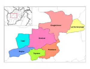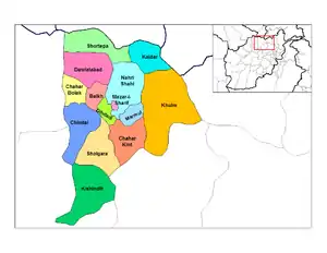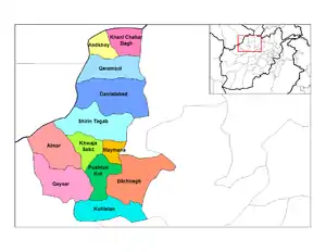 The districts of Afghanistan, known as wuleswali (Pashto: ولسوالۍ, wuləswāləi; Persian: شهرستان, shahrestān), are secondary-level administrative units, one level below provinces. The Afghan government issued its first district map in 1973.[1][2] It recognized 325 districts, counting wuleswalis (districts), alaqadaries (sub-districts), and markaz-e-wulaiyat (provincial center districts).[2] In the ensuing years, additional districts have been added through splits, and some eliminated through merges. In June 2005, the Afghan government issued a map of 398 districts.[3] It was widely adopted by many information management systems, though usually with the addition of Sharak-e-Hayratan for 399 districts in total. It remains the de facto standard as of late 2018, despite a string of government announcements of the creation of new districts.