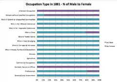 By looking at historical occupation data, males dominate the majority of the occupation types in comparison to females, which is not uncommon for the period of time that the census data was taken. A large percentage of females, however, worked in domestic offices and services, but a very small proportion worked in agriculture or as a professional.