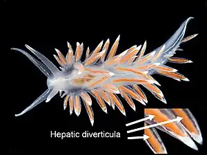 Individual animals within the nudibranch clade Aeolidida have an array of long protruding structures called cerata on their dorsal surface. Located within the cerata of these nudibranchs are hepatic diverticula, which are an outgrowth of the digestive gland or hepatopancreas of the animal. The cerata are translucent, and thus the contents of the diverticula are easily visible from the outside of the animal. Because of this, an aeolid nudibranch automatically takes on the colour of whatever substrate and food source it is living on and feeding on (for example, sea anemones or hydroids). Visually the animal is camouflaged when it is on its food source. The diverticula also serve another important purpose because they pass along to the tips of the cerata any intact nematocysts that have been ingested from the food source. These stinging cells then serve to defend the nudibranch against predation.[2][3]