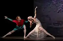 - In 2021, the Royal Opera House put on The Dante Project, choreographed by Wayne McGregor to new music composed and conducted by Thomas Adès, with set and costumes by Tacita Dean. It was danced by The Royal Ballet, led by its principal dancer Edward Watson as Dante, in his final appearance after 20 years working with and interpreting McGregor. The music was performed live by an orchestra of 75 musicians. Sarah Crompton called the work "bold, beautiful, emotional and utterly engaging".[64] The dance is in three sections. "Inferno" shows Dante's journey to hell, guided by Virgil, in "remarkably free and inventive"[64] choreography, "rich in feeling".[64] "Purgatorio" shows Dante meeting two incarnations of his young self, and three of the woman he loves, Beatrice. Watson dances with the living Beatrice (Francesca Hayward) "in lovely, poetic flow",[64] and then with the heavenly Beatrice (Sarah Lamb) "all unfolding limbs and ethereal gestures".[64] "Paradiso" has Dante in heaven with the dancers skittering about the stage all in white, in what Crompton calls a mood "of abstracted joy, deep but dazzling".[64]