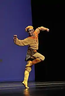 Large-scale group dance is at the center of Shen Yun productions.[10] Each touring company consists of about 40 male and female dancers, who mainly perform classical Chinese dances, making extensive use of acrobatic and tumbling techniques, forms and postures.[27][28]