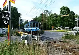 A modern train at the railway crossing of Bråvallavägen, just south of Altorp station in 2012.