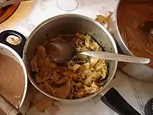 Dobrada (in Portugal) or dobradinha (in Brazil) is a traditional Portuguese and Brazilian dish made from a cow's flat white stomach lining commonly flavoured with paprika, tomato paste, onion, garlic, clove and red pepper paste. Usually, decorated with green onion and mint. The adding of sliced carrots and butter beans are essential as well. White rice is often served alongside this dish, especially in the city of Porto where it is called tripas à moda do Porto.[1]
