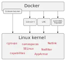The Linux kernel's support for namespaces mostly[16] isolates an application's view of the operating environment, including process trees, network, user IDs and mounted file systems, while the kernel's cgroups provide resource limiting for memory and CPU.[17] Since version 0.9, Docker includes its own component (called libcontainer) to use virtualization facilities provided directly by the Linux kernel, in addition to using abstracted virtualization interfaces via libvirt, LXC and systemd-nspawn.[18][8][9][19]