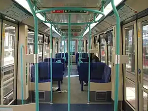 The first three generations of passenger trains consist of 149 high-floor, bi-directional, single-articulated cars, each 28 metres (91 feet 10 inches) long. The cars have four doors on each side (2 per section). When the system was first built, trains sometimes consisted only of a single unit, but now each train is normally composed of two cars coupled together. A third car has been added on the busiest routes since 2010.[8][9][10] Each car has 70 seats and has a total capacity of 284 passengers.[11] The future B23 rolling stock will instead move to a single 5-section unit the length of a 3-car train, with 13 doors per side