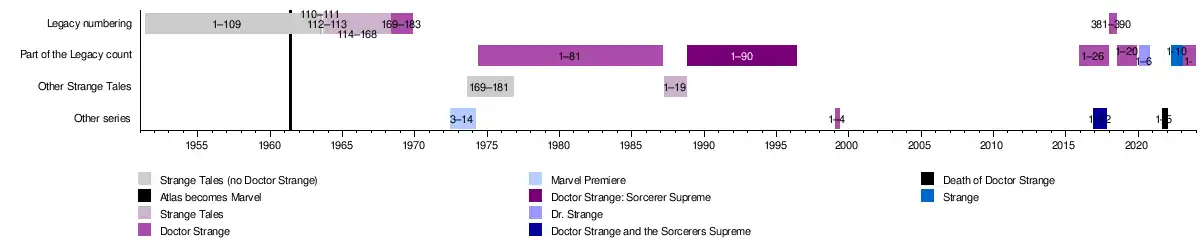 | Publication date | (vol. 1) June 1968 – November 1969 (vol. 2) June 1974 – February 1987 (Sorcerer Supreme) November 1988 – June 1996 (vol. 3) February 1999 – May 1999 (vol. 4) December 2015 – April 2017 (vol. 1 cont.) January 2018 – July 2018 (vol. 5) August 2018 – December 2019 (Dr. Strange) February 2020 – October 2020 |